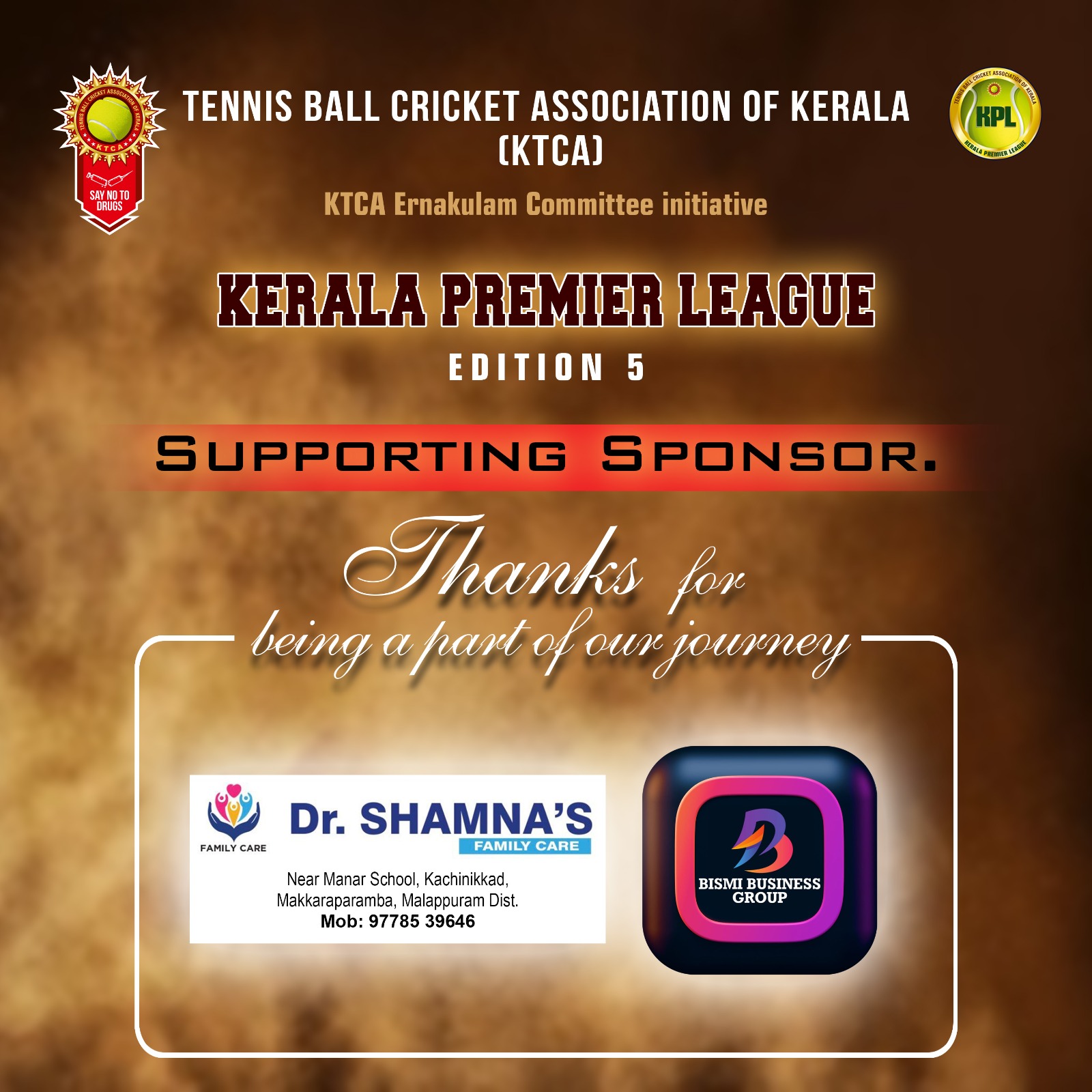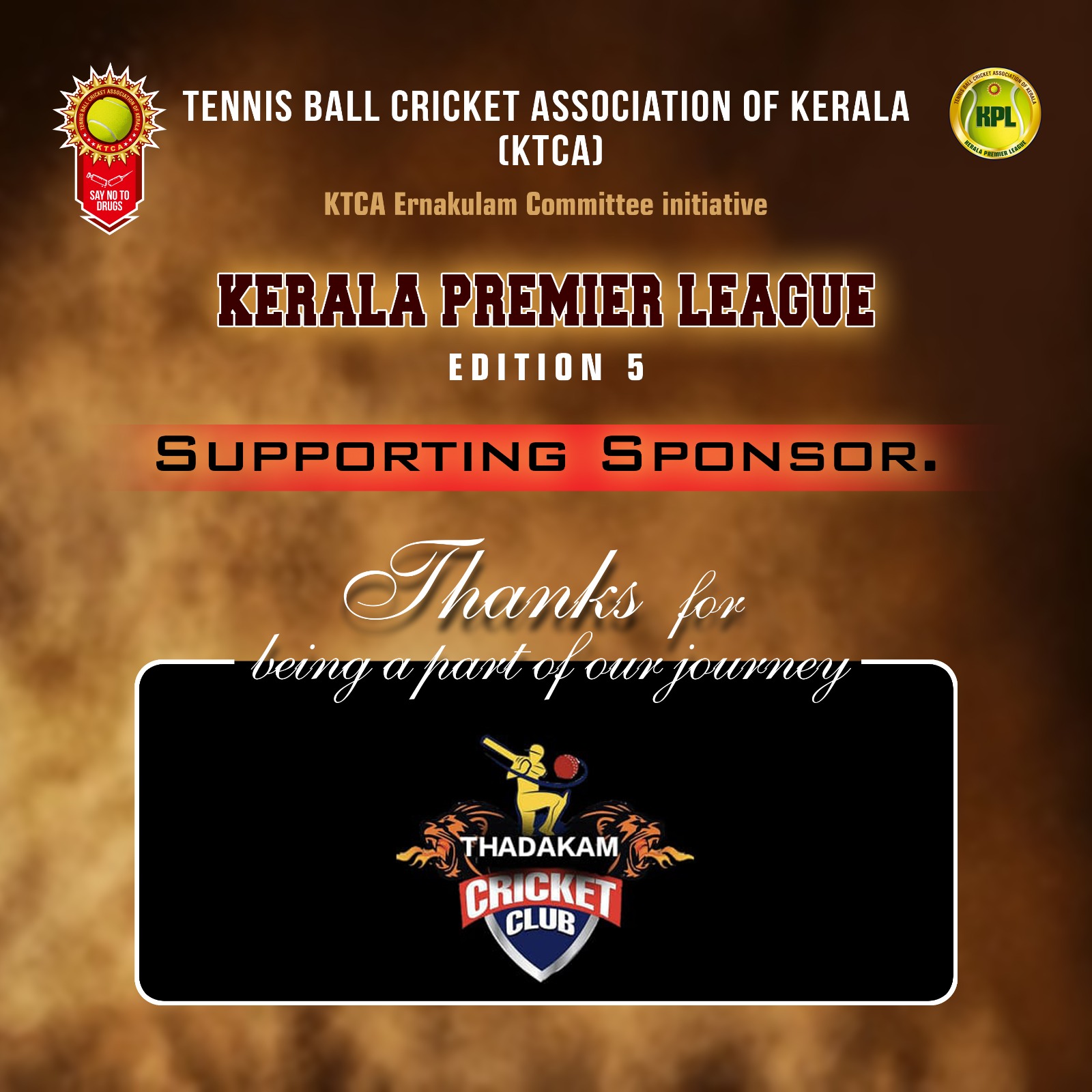 The growth and success of the Tennis Ball Cricket Association of Kerala (KTCA) are made possible by the unwavering support of our valued sponsors and partners. Their trust and commitment play a vital role in empowering young talents, promoting grassroots cricket, and building a strong sporting ecosystem across Kerala.